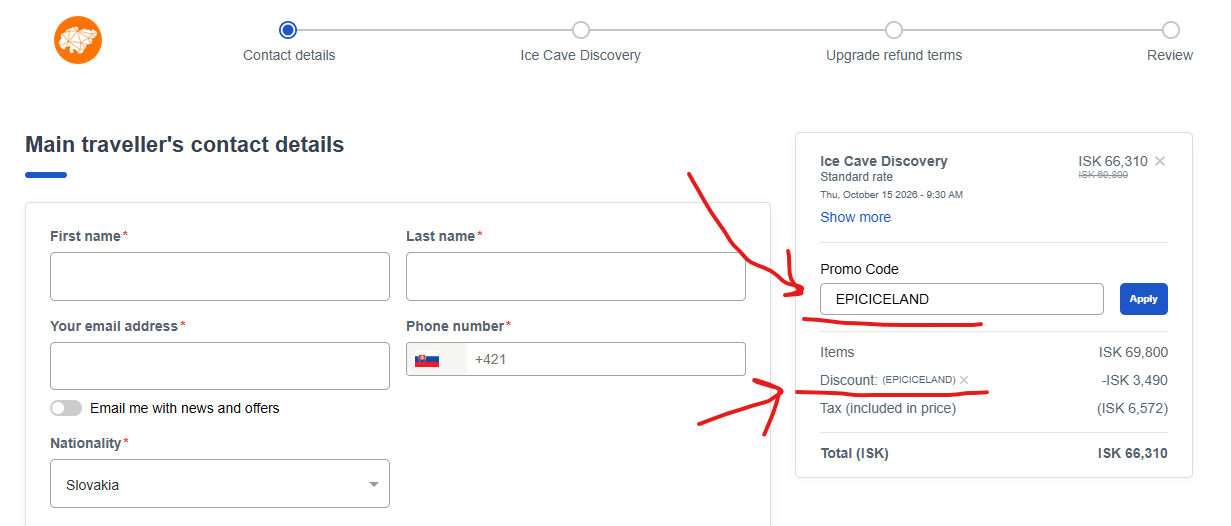 Enter the code EPICICELAND in the promo code field at checkout on localguide.is. The 10% discount will apply to your total before you pay. The code works year-round.
